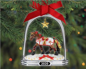 A beautiful silver tone stirrup surrounds a detailed miniature of Breyer’s 2020 Holiday Horse. Striding under a golden star dangling from the top of the stirrup, this charming draft horse is decorated with ribbons and rustic plaid bows.
