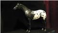 Semi gloss  brown, no white markings, black-shaded nose, darker brown ruff on neck and shoulders,  with dorsal stripe, tan antlers with black tips.   Excellent condition.